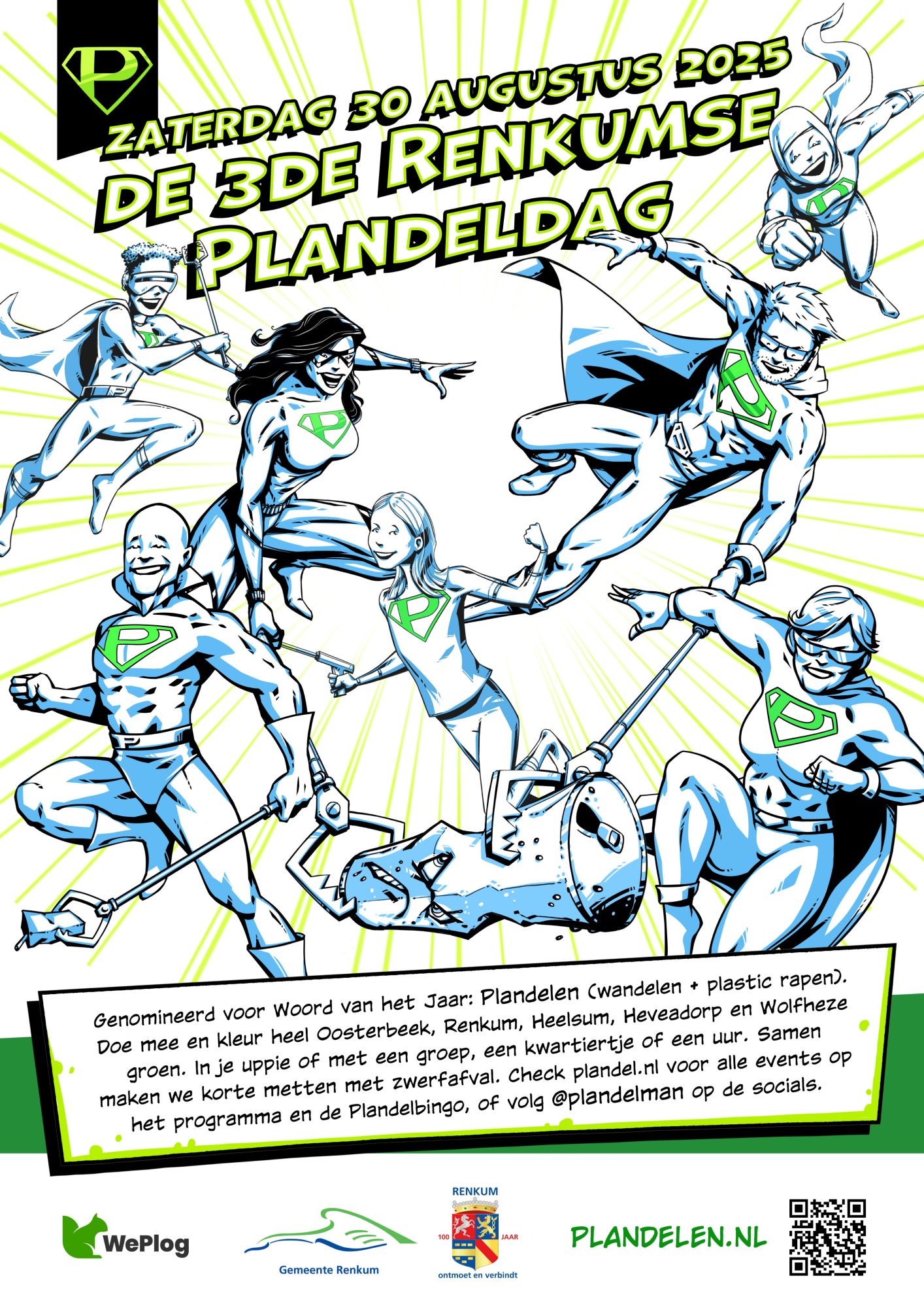 Na de grote vakantie volgt de grote schoonmaak, in Doorwerth, Oosterbeek, Renkum, Wolfheze, Heveadorp en Heelsum. Want op zaterdag 30 augustus trommelt lokale opruimheld Plandelman iedereen op de strijd aan te binden met zwerfafval. Met een speciale app worden de zes dorpen dan ook nog eens virtueel vergroend. De 3de Renkumse Plandeldag opent op zaterdagochtend met koffie in Heelsum (waar een kersverse plandelgroep van start gaat) en trakteert op zaterdagmiddag alle deelnemers die zijn of haar of andermans straatje schoon maakte op groene lekkernijen op de Pasar Kecil in Doorwerth.